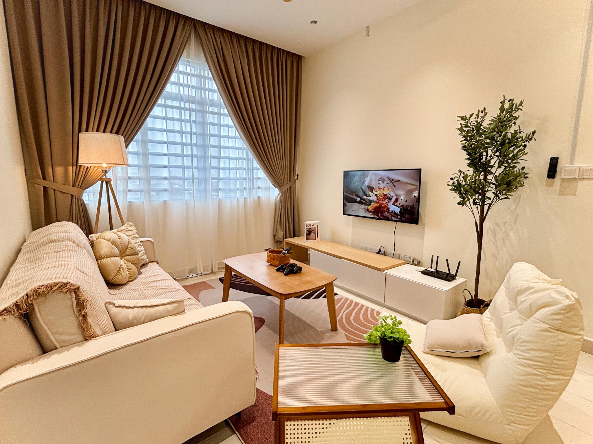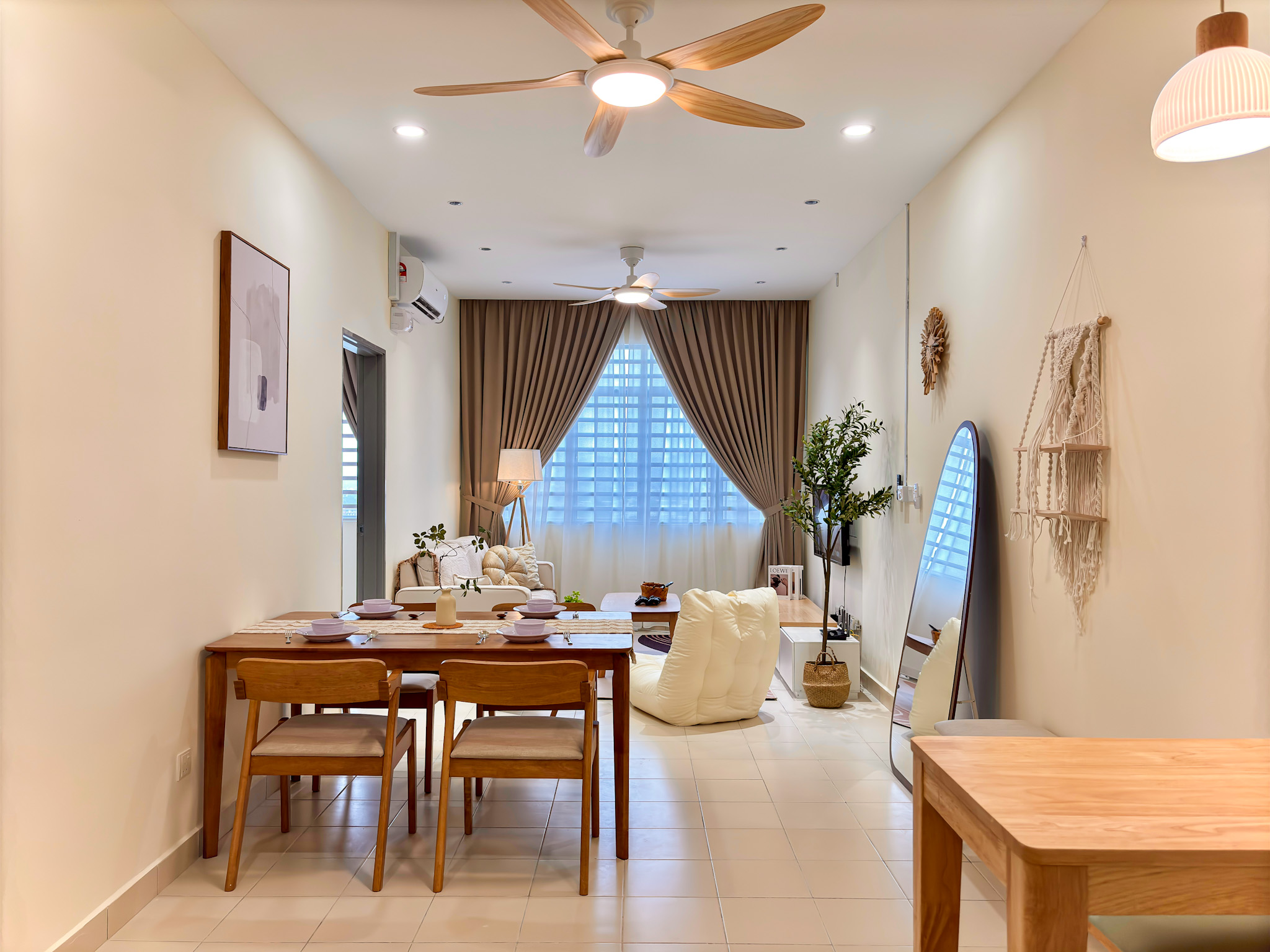 Muji Style Concept, Ipoh Town City View, a cozy and minimalist condo located at Residensi Falim, Ipoh. With 3 air-conditioned bedrooms and 2 bathrooms, it comfortably fits up to 7 guests. Enjoy modern amenities like free WiFi, game stick, water dispenser, fridge, hair dryer, iron, and full kitchenware. The condo also features facilities such as a badminton court and playground, perfect for a relaxing family stay.